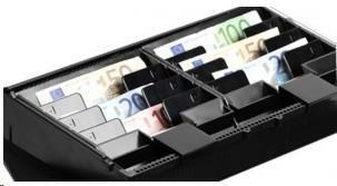 pokladničná zásuvka, otváranie spredu, rozmery (ŠxVxH): 410x114x415mm, 8 priehradiek na bankovky (vertikálne), 8 priehradiek na mince, 1 priehradka na účtenky, 3poz. zámok, priame pripojenie tlačiarne, farba: tmavosivá..