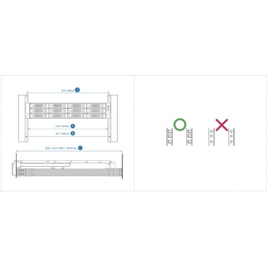 - Vzdialenosť medzi dvoma rackovými stĺpmi (meranie štvorcových otvorov racku stred-stred) je 18,3" (465 mm)
