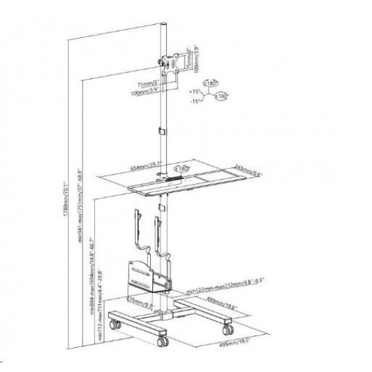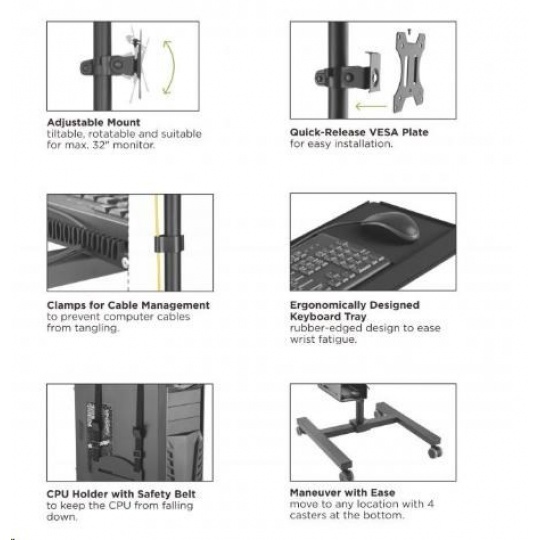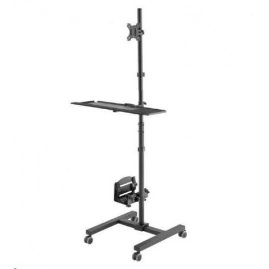 Pojízdný stojan na PC monitor a klávesnici Fiber Mounts AX793 Profesionální řešení pro Vaše mobilní PC pracoviště - mobilní stojan na PC Potřebujete si vytvořit pojízdné PC pracoviště za co nejlepší cenu? Máme pro Vás kompletní řešení za bezkonkurenční cenu - pojízdný stojan s držákem na PC, držákem na monitor a policí na klávesnici. Vše je přitom ergonomické - nastavitelná výška, náklon a natočení monitoru, nastavitelná výška klávesnice a myši, výškové nastavení držáku PC, pojezdová kolečka s aretací. Barevné provedení černé, záruka 3 roky. Stojan na PC s držákem monitoru a policí na klávesnici a myš - mobilní pojízdná PC pracovna -Fiber Mounts AX793 Technické údaje: držák na PC s výškovým polohováním, nosnost 8kg police na klávesnici a myš s výškovým polohováním, nosnost 2kg držák na monitor 17" až 32" s výškovým polohováním, nosnost 10kg držák monitoru podporuje VESA 75x75 a 100x100 / možnost rozšíření až na 200x200 otáčení monitoru do stran +/- 180° náklon monitoru +/- 15° rotace monitoru +/- 180° celková nosnost stojanu 20kg pojezdová kolečka s brzdou systém vedení kabeláže výborná kvalita barevné provedení černé záruka 3 roky Profesionální PC pracovna, pojízdná / mobilní - Fiber Mounts AX793 Stojan na PC, monitor a klávesnici s myší AX793 podporuje VESA standardy pro uchycení monitorů: VESA 75x75 VESA 100x100 v případě potřeby možnost zakoupení rozšíření na VESA 200x100 v případě potřeby možnost zakoupení rozšíření na VESA 200x200.