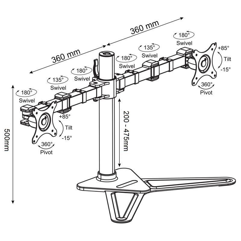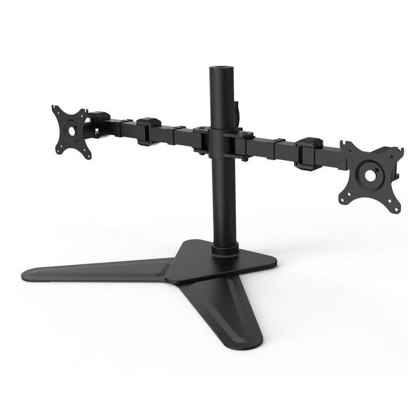 Stolový držiak na 2 monitory ErgoSolid NF22LG Stolný držiak s podstavou na 2 monitory 15-32", otáčanie do strán, náklon, dĺžkové a výškové nastavenie, funkcia pivot, farba čierna, záruka 3 roky Kvalitný a dizajnovo veľmi pekný plne polohovateľný stolový držiak na zavešenie 2 monitorov. Stabilný podstavec, bez nutnosti kotvenia do stola. 2 nezávislé ramena umožňujú nastavenie polohy každého monitora podľa Vašej potreby - otáčanie do strán, náklon, nastavenie vzdialenosti od podstavca, nastavenie výšky monitora od stola, funkcia pivot. Farba čierna. Záruka 3 roky. Stolový držiak na 2 monitory alebo notebooky - ErgoSolid NF22 Technické údaje: nosnosť 20kg (2x10kg) zavesenie 2 monitorov s uhlopriečkami 15-32" podpora VESA štandardu 75x75 a 100x100 nezávislé otáčanie monitorov do strán +/- 90° nezávislé naklonenie monitorov +85° / -15° funkcia pivot - nezávislé otočenie monitora na šírku alebo na výšku korekcia roviny monitorov ľahké nastavenie výšky monitora od stolovej dosky 200-475mm dĺžka ramena 360mm, 3 kĺby stabilná konštrukcia - bez kotvenia do stolovej dosky výborná kvalita farba čierna záruka 3 roky Stolový držiak na 2 monitory podporuje VESA štandardy: VESA 75x75 VESA 100x100