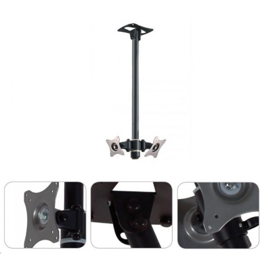 Stropní držák Tv monitoru EDBAK SV32 Profesionální stropní držák pro zavěšení 2 televizorů nebo monitorů 17-37" za sebe, výškové nastavení, otáčení, náklon, funkce PIVOT Stropní držák nejvyšší kvality pro zavěšení 2 obrazovek s úhlopříčkou 17-37". Držák umožňuje kompletní nastavitelnost - regulaci výšky, otáčení jednotlivých obrazovek do stran, náklon a rotaci - funkce PIVOT. Konstrukce je ocelová, silnostěnná. Držák podporuje VESA standardy 75x75 a 100x100, je možné zakoupit rozšíření na 200x100 a 200x200. Kabeláž je možné vést vnitřkem držáku. Vybírat můžete ve 2 barevných variatách - černé a stříbrné. Záruka 10 let. Stropní držák na nezávislé zavěšení 2 obrazovek zády k sobě - Edbak SV32 Technické údaje: maximální zatížení 20kg doporučená úhlopříčka Tv nebo monitoru 17" až 37" podporuje VESA standardy 75x75 a 100x100 za příplatek možnost rozšíření VESA standardu na 200x100 nebo 200x200 délka držáku 730mm nastavení vzdálenosti od stropu nezávislé otáčení obrazovek na obě strany +/- 90° náklon obrazovky nahoru nebo dolů +/- 60° funkce PIVOT - horizontální nebo vertikální natočení obrazovky profesionální stropní držák na 2 obrazovky materiál ocel barevné provedení černé nebo stříbrné záruka 10 let Držák podporuje VESA standardy: VESA 75x75 VESA 100x100 VESA 200x100 - za příplatek VESA 200x200 - za příplatek.