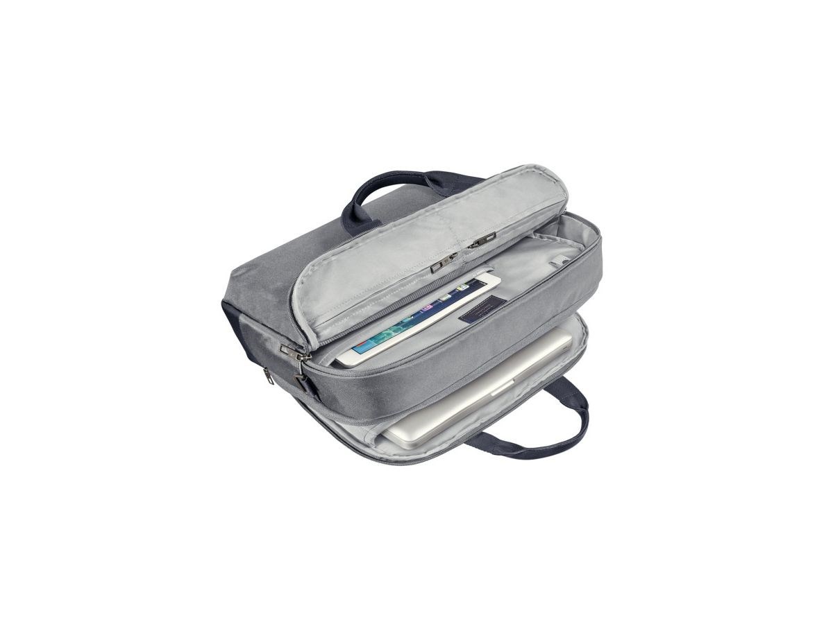 Kvalitná, ľahká a kompaktná taška s dvoma hlavnými a jedným menším predným vreckom. Výrazný a elegantný dizajn dopĺňajú kvalitné zipsy a štýlové matné kovové pracky. Čierna povrchová úprava s kontrastným zeleným vnútrom na ľahšie hľadanie predmetov. Taška ponúka priestor pre všetky vaše mobilné zariadenia, 15,6" notebook a dokumenty do veľkosti A4. Môže sa pohodlne prenášať vďaka polstrovaným rukovätiam z pravej kože alebo nastaviteľnému ramennému popruhu, prípadne sa dá pripevniť na rukoväť kufra na kolieskach. Vlastnosti Ľahký, pevný polyester na pohodlné každodenné používanie Predné vrecko umožňuje rýchly prístup k telefónu, pasu, písacím potrebám a vizitkám 18 vreciek vrátane predného vrecka na miniatúrny tablet alebo čítačku kníh Chytré detaily, ako je integrovaná utierka na obrazovku alebo krúžok na kľúče Samostatné odnímateľné vrecko na napájací adaptér a iné káble Praktické priehľadné sieťované vrecká na káble a drobné príslušenstvo Polstrované vrecko na tablet a notebook s mäkkým rúnom na ochranu obrazovky a povrchu zariadenia Skryté vrecko na telefón na pripojenie slúchadiel..