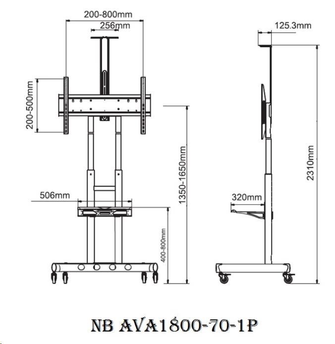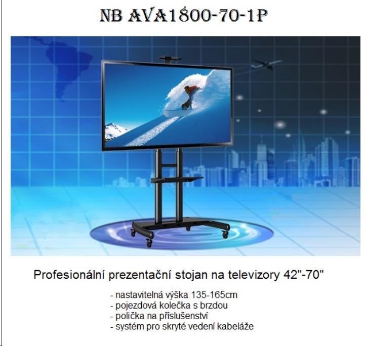 Technické údaje: •maximální zatížení 90kg •na Tv 42" až 80" •VESA standart 200x200 až 800x500 •min. výška stojanu 1350mm •max. výška stojanu 1650mm •nastavitelná výška obrazovky •funkce uzamčení televizoru •systém vedení kabeláže •police na příslušenství (odnímatelná, součást balení) •šířka poličky 506mm, hloubka poličky 320mm •polička na kameru, webkameru nebo projektor (odnímatelná, součást balení) •šířka poličky 256mm, hloubka poličky 125mm •pojezdová kolečka, všechna opatřena brzdou •rozměry podstavce: šířka 1000mm, hloubka 716mm •dokonalá stabilita •profesionální konstrukce •velmi pěkný design •barevné provedení černé nebo bílé •záruka 5 let.