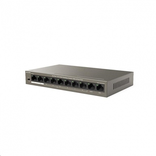 - Porty: 8x 10/100Mbps RJ45 s automatickým vyjednávaním, Port1 až Port8 podporuje IEEE802.3 štandardné porty PoE at/af + 2x 10/100Mbps pre Uplink