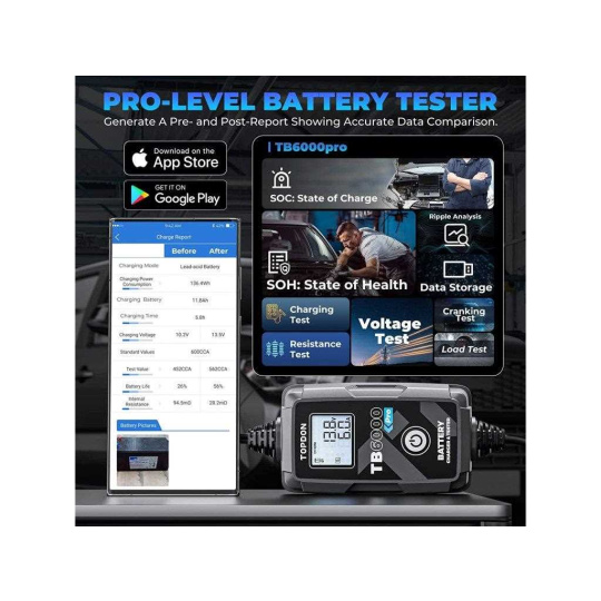 TOPDON TB6000Pro ponúka ako prvý v odbore inteligentný režim nabíjania, ktorý dokáže zobraziť report pred a po nabíjaní, ktorý ukazuje presné porovnanie údajov.
