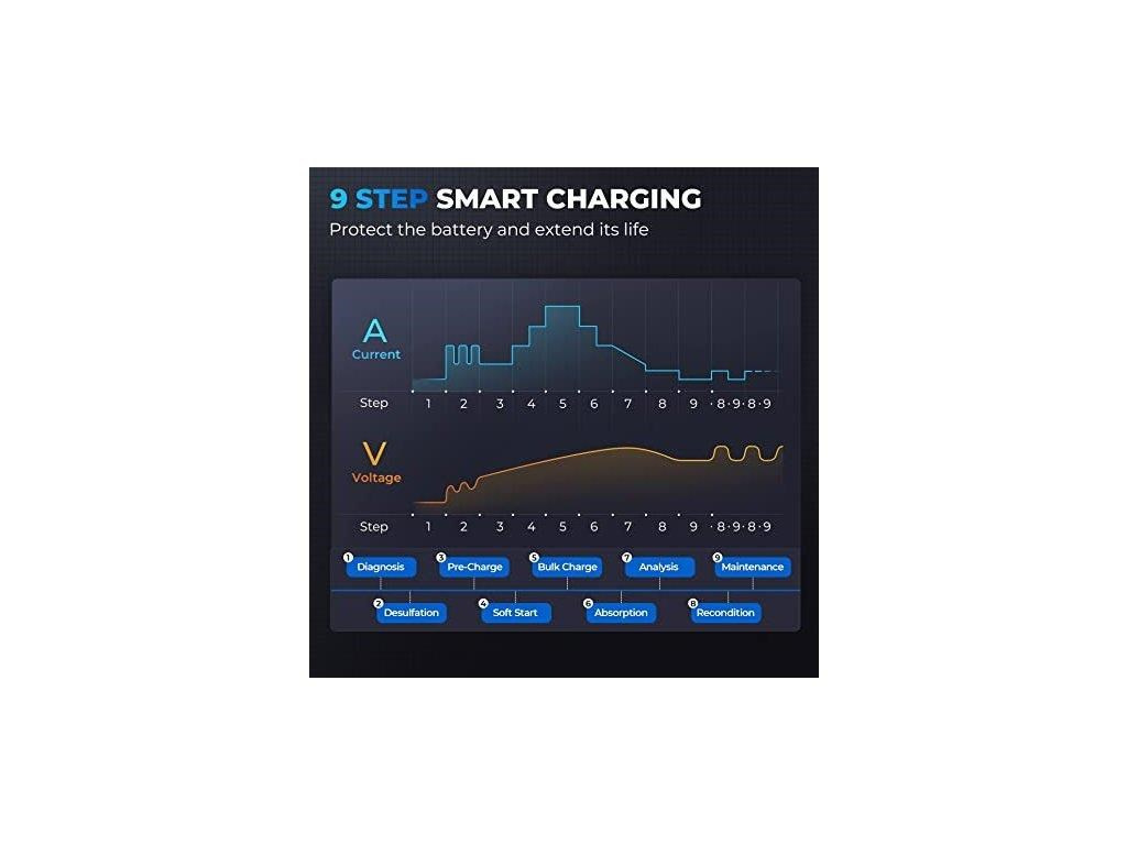 9stupňové inteligentné nabíjanie poskytuje silnú ochranu batérie a automatický systém odpojenia eliminuje riziko prebíjania. Používajte režimy NORM (bežné)/COLD (v chlade)/REPAIR (oprava), aby ste sa prispôsobili potrebám vašej batérie a tým predĺžili jej životnosť.