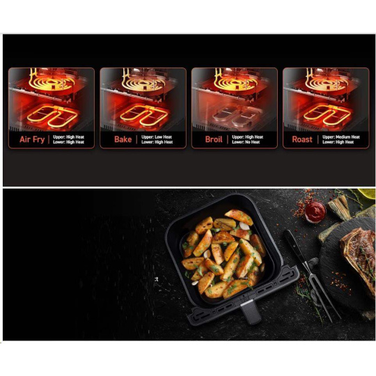 S horkovzdušnou fritézou COSORI CAF-P583S SMART si môžete vychutnať vaše obľúbené vyprážané jedlá bez výčitiek, pretože na rozdiel od bežného vyprážania alebo fritovania je v tejto horkovzdušnej fritéze možné pripravovať jedlá s použitím veľmi malého množstva oleja alebo vôbec žiadneho. Patentovaná technológia THERMO IQ 360° HEAT CIRCULATION presne reguluje teplotu inteligentným teplotným algoritmom a zabezpečuje tak rovnomerné uvarené jedlo bez nutnosti jeho pretierania alebo otáčania. Kombinácia cirkulujúceho horúceho vzduchu, dokonalé teploty varenia a chytrých programov zabezpečí, že hranolky budú vždy krásne chrumkavé a kuracie stehná šťavnaté. Programy si môžete rýchlo a pohodlne nastaviť aj prostredníctvom smartfónu alebo Amazon Alexa a Google Assistant. Až budete mať hotovo, čistenie bude rovnako jednoduché vďaka nepriľnavému košu, ktorý je možné umývať v umývačke riadu. Vďaka veľkej nádobe s objemom 6,4l navyše môžete rýchlo uvariť aj pre väčšiu rodinu alebo skupinu hostí.