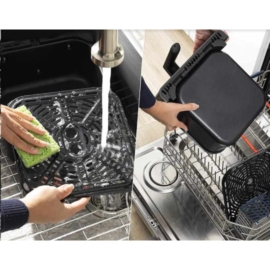 Vyjímateľný fritovací koš a nádoba sú vyrobené z odolného, nepriľnavého a zdravotne nezávadného materiálu (BPA a BFOA FREE) a je možné ich umývať v umývačke riadu. Vždy vychladená rukoväť a tlačidlo na uvoľnenie koša eliminujú riziko popálenia a nechceného uvoľnenia.