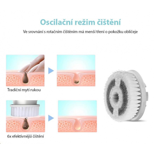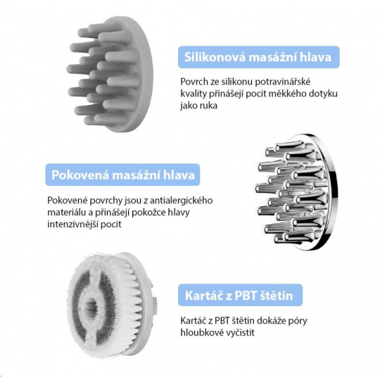 Mäkká masážna hlavica používa mäkké silikónové výstupky, ktoré jemne masírujú pokožku a uvoľňujú napätie a únavu. Zlepšuje tiež prekrvenie pokožky hlavy. Hrubé masážne hlavice používajú tvrdé výstupky, ktoré stimulujú spánok, podporujú pocit uvoľnenia, zlepšujú krvný obe a pomáhajú podporiť zdravý rast vlasov. Kefková hlavica pre čistenie tváre má mäkké hodvábne štetiny, ktoré jemne čistia pleť. Sonické vibrácie pomáhajú štetinám lepšie sa dostať do pórov a odstrániť z pleti nečistoty, prebytočnú mastnotu a zvyšky make-upu.