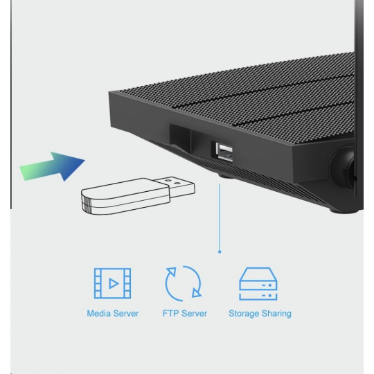 - USB port na pripojenie flash disku či HDD (media server, zdieľanie úložiska, FTP server)