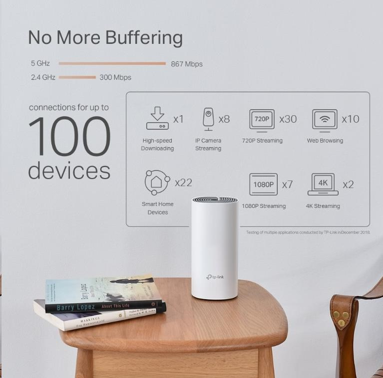| Dosah WiFi | 4-6+ izbových domov (3-pack) Technológia TP-Link Mesh Voliteľná ethernetová spätná väzba na spojenie jednotiek Deco pre bezproblémové pokrytie Powerline technológia Používa elektrické vedenie vášho domu na vytvorenie silnejších spojení medzi jednotkami Deco, čím sa znižuje dopad stien alebo iných prekážok na signál 2 × dual-bandantény Viacnásobné antény vytvárajú pole zosilňujúce signál na pokrytie viacerých smerov a veľkých oblastí |