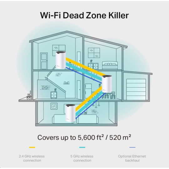| WiFi Dosah | 3-5 izbové domy (3-pack) TP-Link Mesh technológia Voliteľný Ethernet backhaul spolupracuje, aby prepojil jednotky Deco a zabezpečil plynulé pokrytie 3× antény (vnútorné) Viaceré antény tvoria mriežku na zosilnenie signálu a pokrytie väčších oblastí Beamforming Sústreďuje bezdrôtový signál smerom ku klientom, čím rozširuje WiFi dosah |