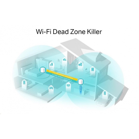 | WiFi Dosah | 4-6-izbové domy (3-pack) Tp-Link Mesh technológia Voliteľná Ethernetová spätná väzba spolupracuje na spojení jednotiek Deco pre plynulé pokrytie 2× antény (vnútorné) Viaceré antény tvoria poľvý zosilňovací rad na pokrytie viac smerov a veľkých plôch Beamforming Sústreďuje bezdrôtovú silu signálu smerom ku klientom, aby sa rozšíril WiFi dosah |