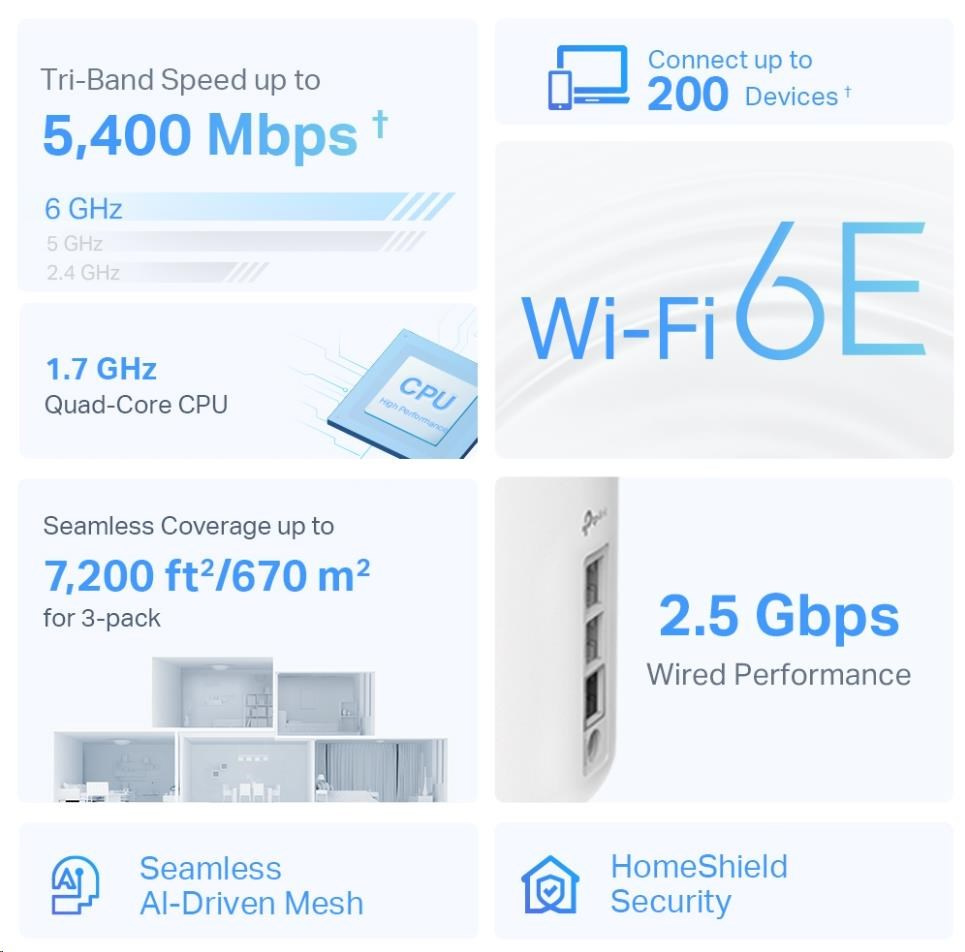 | WiFi dosah | Rodinné domy 1-3 izby (1-balíček) Tp-Link Mesh technológia Voliteľný Ethernet backhaul spolupracuje na prepojení Deco jednotiek pre plynulé pokrytie AI-Driven Mesh Inteligentne sa učí prostredie siete na poskytovanie ideálneho Wi-Fi špecifického pre váš domov 4× High-Gain Antény (Vnútorné) Viacero antén tvorí radar na zosilnenie signálu, pokrývajúci viaceré smery a veľké plochy Tri-pásmo Novým otvoreným 6 GHz pásmom prináša viac šírky pásma a rýchlejšie rýchlosti Beamforming Zameriava bezdrôtový signál na klientov na rozšírenie WiFi dosahu |