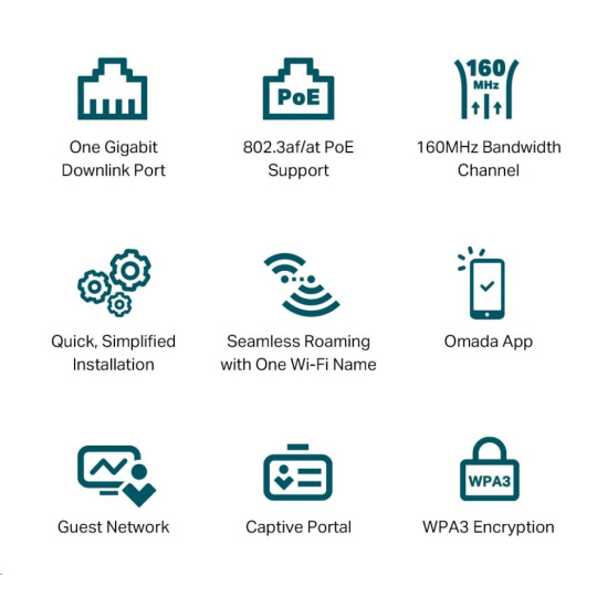 | Wireless Security | • Captive Portal Authentication • Access Control • Wireless Mac Address Filtering • Wireless Isolation Between Clients • VLAN • Rogue AP Detection • 802.1X Support • WPA-Personal/Enterprise, WPA2-Personal/Enterprise, WPA3-Personal/Enterprise |