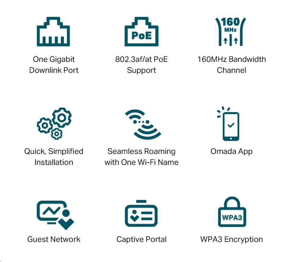 | Wireless Security | • Captive Portal Authentication • Access Control • Wireless Mac Address Filtering • Wireless Isolation Between Clients • VLAN • Rogue AP Detection • 802.1X Support • WPA-Personal/Enterprise, WPA2-Personal/Enterprise, WPA3-Personal/Enterprise |
