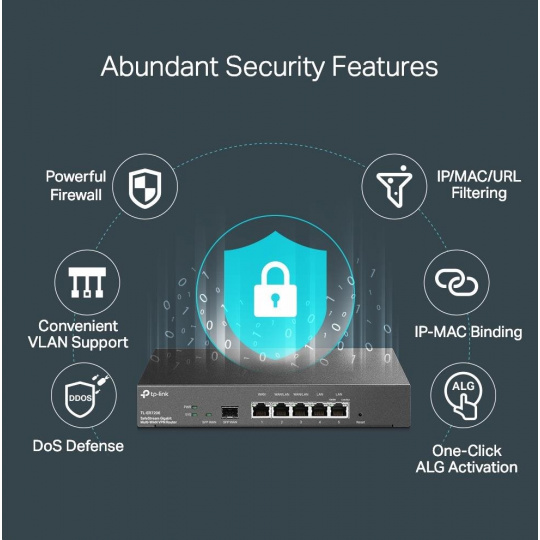 - Mnoho funkcií zabezpečenia - Pokročilé zásady firewallu, ochrana pred útokmi DoS, filtrovanie adries IP/MAC/URL a ďalšie bezpečnostné funkcie na ochranu vašej siete a dát.
