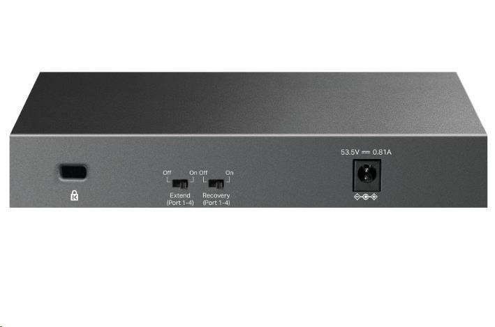 | Advanced Features | • Extend Mode Button (Porty 1–4, až 250 m PoE napájanie a prenos dát) • PoE Auto Recovery Button (Porty 1-4) • Kompatibilný s IEEE 802.3af/at PD • Automatické učenie MAC adries a automatické červenanie • IEEE 802.3x Flow Control • Green technológia |