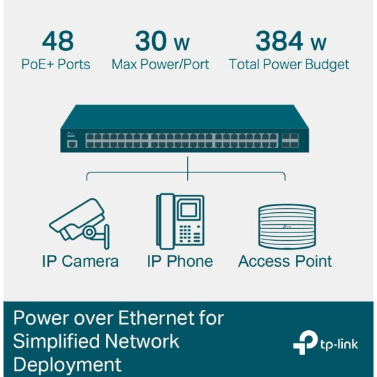 - PoE s rozpočtom napájania 384 W - 48 portov PoE+ zodpovedajúcich štandardu 802.3at/af, ktoré disponujú celkovým výkonom 384 W.