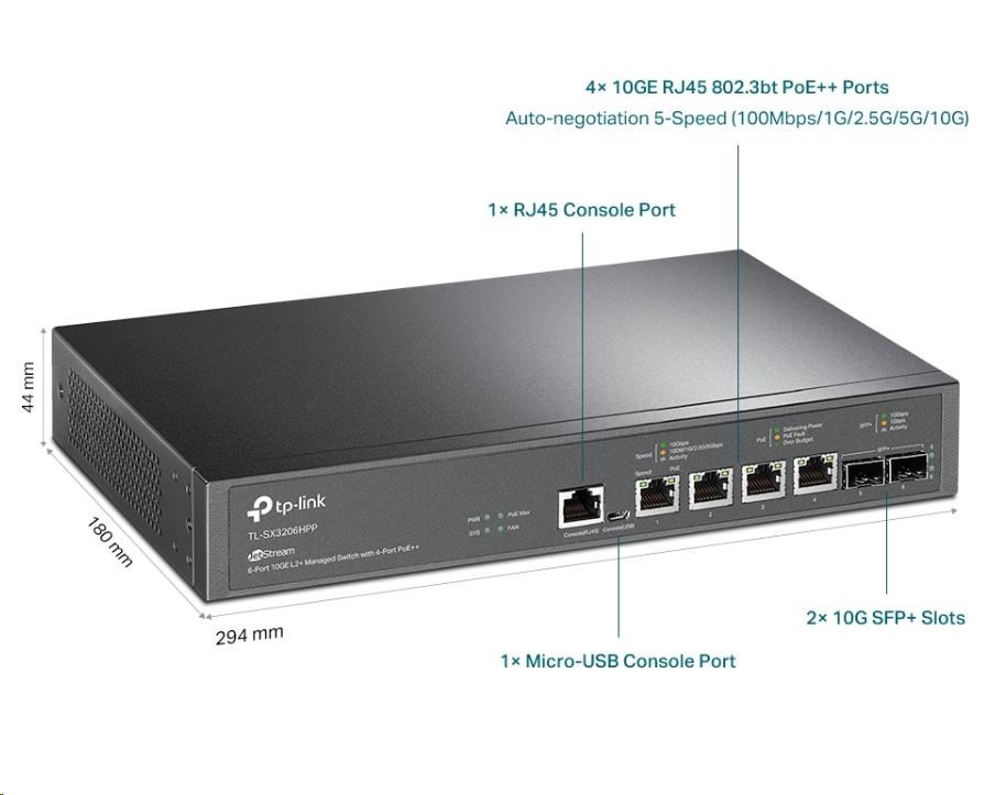 | Rozhranie | • 4× 100/1000/2500/5000/10000 Mbps RJ45 porty • 2× 10G SFP+ zásuvy • 1× RJ45 konzolový port • 1× Micro-USB konzolový port |