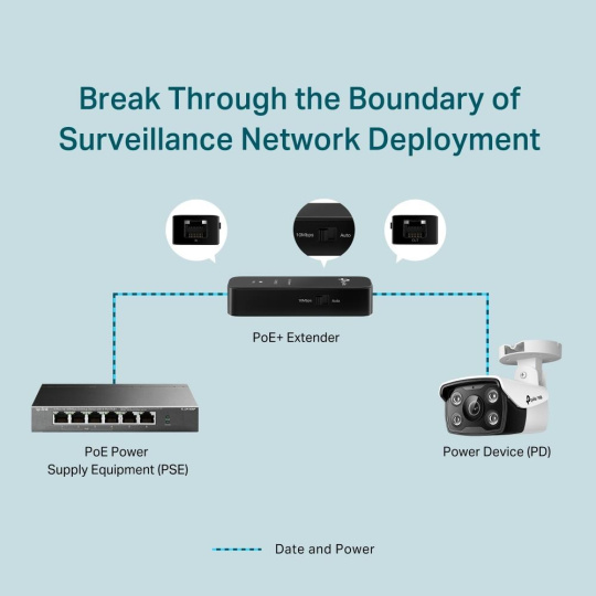 Fast Ethernet PoE+ Extender TL-POE10E rozširuje PoE/PoE+ sieťové pripojenie o ďalších 100 m – 250 m (režim 10 Mbps) od zdroja napájania PoE. TL-POE10E rozširuje nasadenie siete o zariadenia kompatibilné s 802.3af/at PoE, čo ho robí ideálnym pre požiadavky na dlhé káblovanie pri kamerových systémoch. Vzdialenosť už nebude prekážkou pre nasadenie siete.