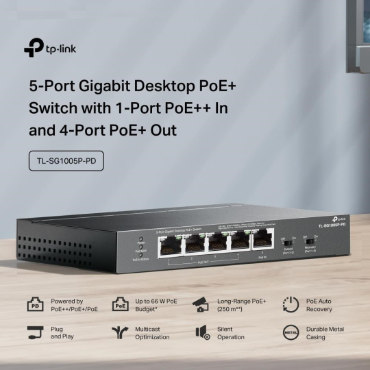 TP-Link switch TL-SG1005P-PD (5xGbE,4xPoE+,1xPoE-in,PoE++,90W, fanless)