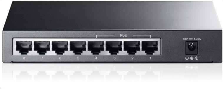| Interface | • 8× 10/100 Mbps RJ45 portov (4× 10/100 Mbps 802.3af/at PoE+ portov) • Automatické vyjednávanie • AUTO MDI/MDIX |