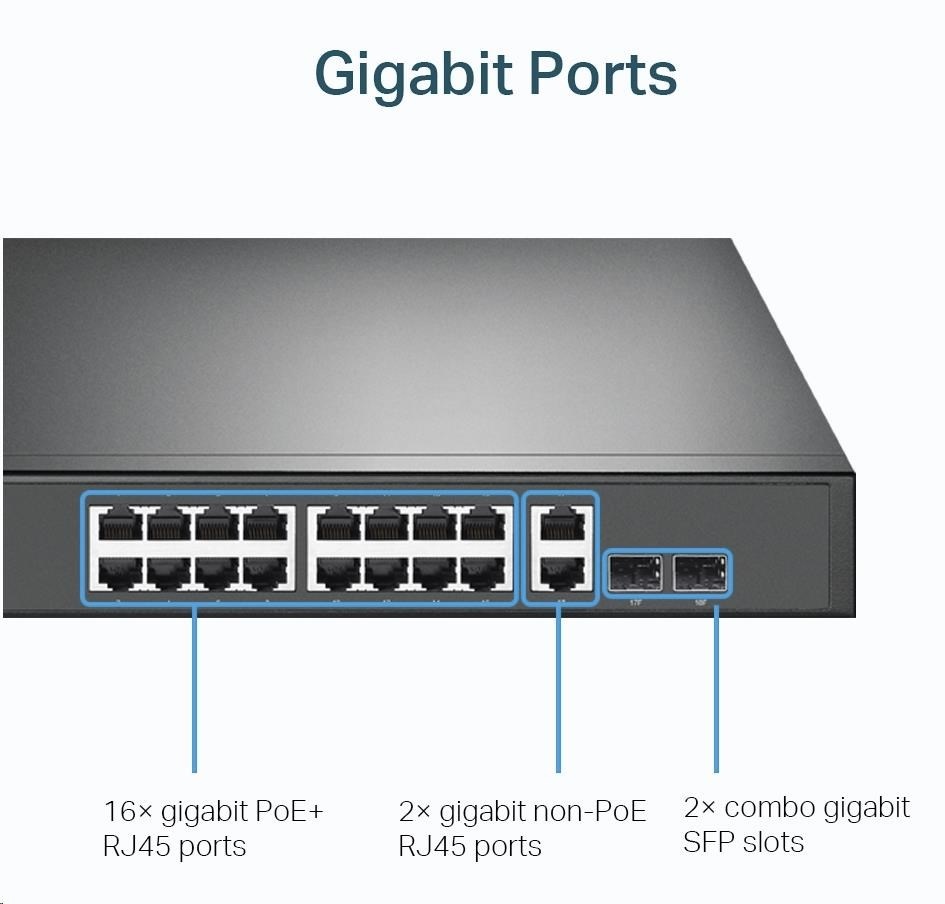 - 16× Gigabit PoE+ RJ45 portov, 2× Gigabit on-PoE RJ45 porty a 2× Combo Gigabit SFP zásuvky