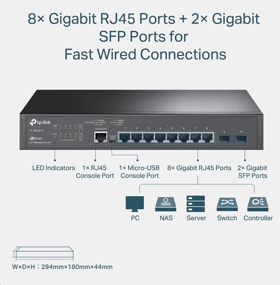 - Plne gigabitové porty -8 gigabitových portov RJ45 a 2 porty SFP poskytujú vysokorýchlostné pripojenie.