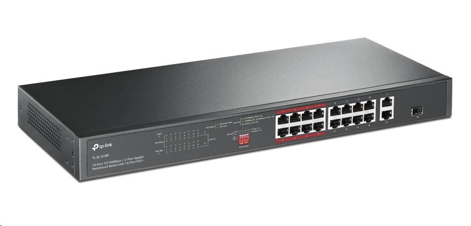 TP-Link CCTV switch TL-SL1218P (16x100Mb/s, 1xGbE uplink, 1xGbE/1xSFP combo uplink, 16xPoE+, 150W)