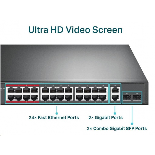 | Rozhranie | 24× PoE+ 10/100 Mbps RJ45 portov  2× 10/100/1000 Mbps RJ45 portov 2× Combo gigabitové SFP sloty  |