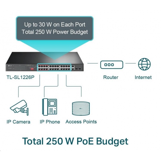 Vyhovuje štandardu 802.3af/at PoE + a podporuje až 30 W napájania na každom PoE porte. Celkový výkon napájania až 250 W PoE pre 24× PoE portov, umožňuje široké spektrum aplikácií, ako je dohľad, kancelárie, koleje a malé podniky. Je plne kompatibilný s IP kamerami, prístupovými bodmi, IP telefónmi, počítačmi, tlačiarňami atď.