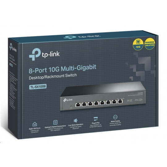 Switch TL-SX1008, ktorý je vlajkovým produktom segmentu 10G, je 8portový stolný/rackový switch 10G s kapacitou prepínania až 160 Gbit/s. Funkcia automatického vyjednávania rýchlosti 5rýchlostného pripojenia (100 Mbit/s / 1G / 2.5G / 5G / 10G) monitoruje rýchlosť pripojenia a inteligentne ju prispôsobuje pre kompatibilitu a optimálny výkon všetkých vašich zariadení, vrátane úložísk NAS 10G, serverov 10G, pracovných staníc, herných počítačov, prístupových bodov 2.5G/5G/10G Wi-Fi 6, 8K videí, stolných počítačov a ďalších aplikácií.
