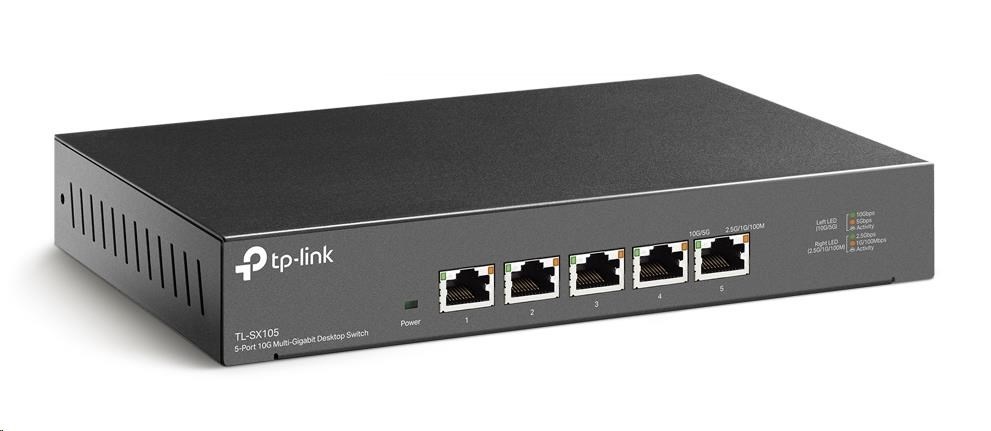 Switch TL-SX105, ktorý je vlajkovým produktom segmentu 10G, je 5portový stolový prepínač 10G s kapacitou prepínania až 100 Gbit/s. Funkcia automatického vyjednávania rýchlostí 5rýchlostného pripojenia (100 Mbit/s / 1G / 2.5G / 5G / 10G) monitoruje rýchlosť pripojenia a inteligentne ju prispôsobuje pre kompatibilitu a optimálny výkon všetkých vašich zariadení, vrátane NAS 10G, 10G serverov, pracovných staníc, herných počítačov, prístupových bodov 2.5G / 5G / 10G WiFi 6, 8K videí, stolových počítačov a ďalších aplikácií.