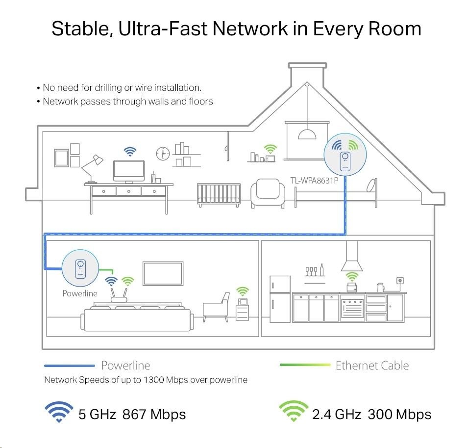 - Dvoupásmová sieť Wi-Fi AC1200 – zariadenie rozšíri ultra rýchlu dvoupásmovú Wi-Fi sieť s rýchlosťou až 867 Mbit/s v pásme 5 GHz a až 300 Mbit/s v pásme 2,4 GHz.