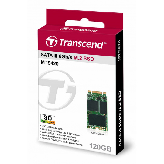 Ultrakompaktný disk MTS420 M od spoločnosti Transcend využíva rozhranie SATA III 6 Gb/s a najnovšiu technológiu 3D NAND.2 SSD je vhodný na riešenie potrieb vysokého výkonu a prísnych veľkostných obmedzení malých zariadení. Vďaka použitiu iba vysokokvalitných flash čipov a vylepšených algoritmov firmvéru je Transcend MTS420 M.2 SSD poskytuje bezkonkurenčnú spoľahlivosť.