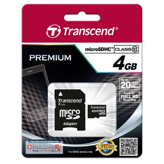 Karta TRANSCEND MicroSDHC 4GB Class 10 + adaptér