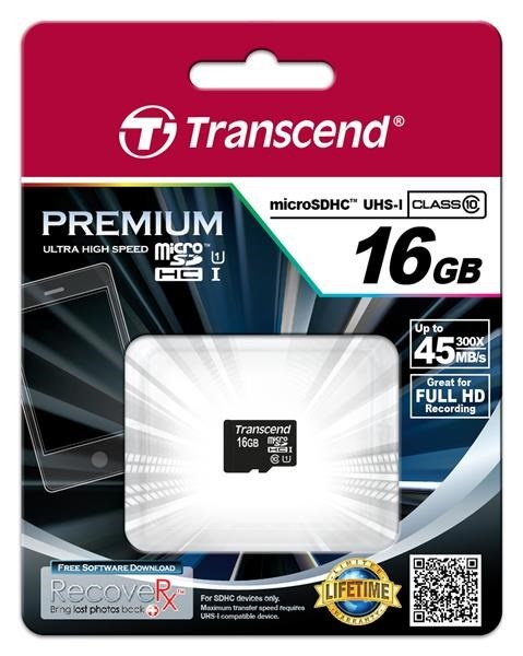 Karta TRANSCEND MicroSDHC 16GB Premium, Class 10 UHS-I 300x, bez adaptéra