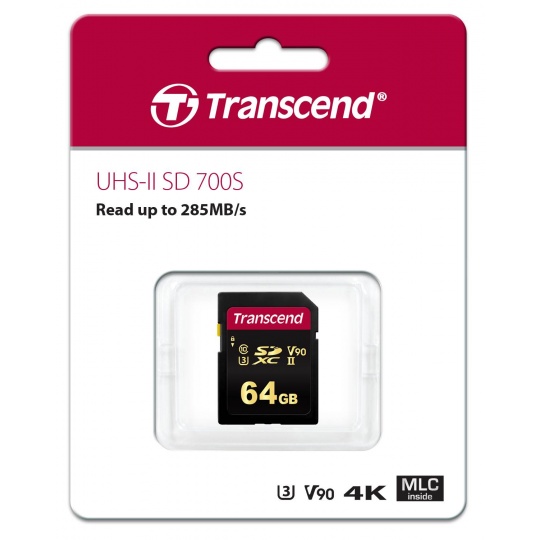 Pamäťové karty Transcend SDXC/SDHC 700S spĺňajú štandardy UHS-II Speed Class 3 (U3) a UHS Video Speed Class 90 (V90) pre videozáznamy v rozlíšení 4K Ultra HD s rýchlosťou čítania/zápisu až 285 MB/s a 180 MB/s.