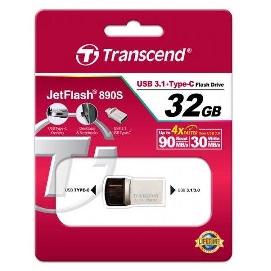 TRANSCEND Flash disk 32GB JetFlash®890S OTG, USB 3.1 typ C/A (R:90/W:30 MB/s) strieborná