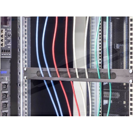 19" 1U priechodný panel, horizontálne delený, kefka, otvor 350 x 21 mm.