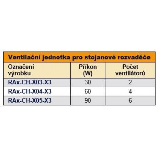 RAB-CH-Xxx-X3, RAC-CH-Xxx-X3 Tieto ventilačné jednotky sú navrhnuté špeciálne pre skrine montované do stojana. Montujú sa podľa potreby do podlahy, krytu alebo dverí rozvádzača. Ventilačná jednotka pre stojanové rozvádzače - inštaluje sa do uzáveru z vonkajšej strany rozvádzača, do základne z vnútornej strany rozvádzača. Pri inštalácii do základne skrine sa musí použiť montážny rám spodnej ventilačnej jednotky - RAx-CH-Xxx-X1, ktorý sa inštaluje pomocou obojstrannej lepiacej pásky. Odporúčame tiež podstavec na prívod vzduchu pod rozvádzač. Nastavenie teplotného rozsahu: bimetalový termostat Nominálne napätie (V/Hz): 230/50-60..
