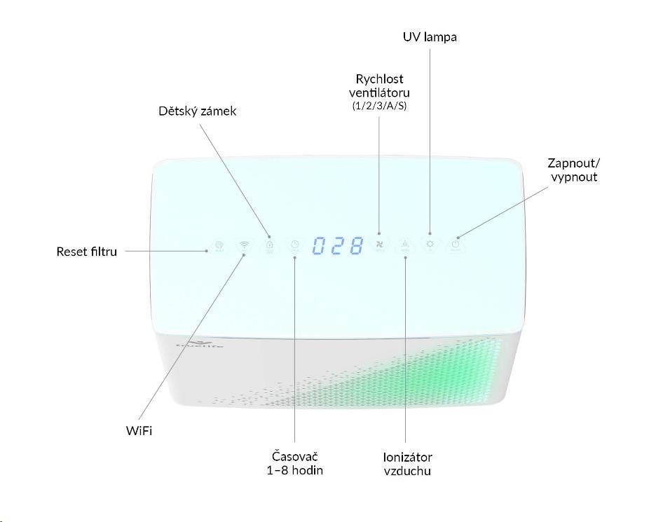 Ovládanie čističky vzduchu je veľmi jednoduché a intuitívne. Všetky funkcie môžu byť nastavené pomocou ikon na dotykovom displeji.