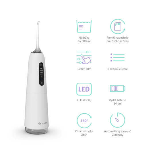 Doprajte si dokonalú každodennú dentálnu hygienu s pomocou dobíjacej ústnej sprchy TrueLife AquaFloss Compact C200. Jej použitie je šetrnejšie ako v prípade zubných nití a medzizubných kefiek, zároveň prináša aj úsporu peňazí. Väčšina zubných kazov má svoj pôvod v medzizubných priestoroch, ale vďaka technológiám StreamTrue®, PulseTrue® a 5 režimom čistenia nemajú šancu. Pri režime DIY si navyše prispôsobíte tlak podľa potreby. Nádržka s objemom 300 ml pojme dostatok vody na celé čistenie, ktoré trvá 2 minúty, čo postráži automatický časovač. Ústna sprcha je vybavená dvoma spôsobmi plnenia vodou - zboku a zhora. Praktické plnenie horným otvorom je rýchlejšie a užívateľsky prívetivejšie ako plnenie z boku, ktorým disponujú štandardné ústne sprchy. Použitie ústnej sprchy je tak pohodlné a šetrí čas. Batéria sprchy vydrží pri užití 2× denne až 14 dní. Kompaktný dizajn prístroja umožňuje jeho ľahké zbalenie aj na cesty, zabudovaný LCD displej zobrazuje zvolený režim a stav batérie. Funkcia pamäť zaisťuje, že sa pri opätovnej aktivácii sprchy spustí naposledy použitý režim. Sprcha pokrýva prostredníctvom pribalených 4 trysiek rôzne dentálne potreby.