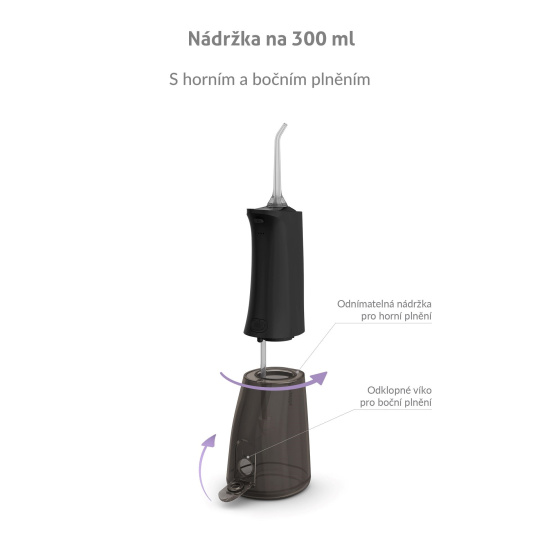 Nádržka s objemom 300 ml vystačí na vyčistenie celého chrupu a zároveň je dostatočne kompaktná. Okrem obyčajnej vody ju môžete naplniť ústnou vodou pre extra sviežosť.