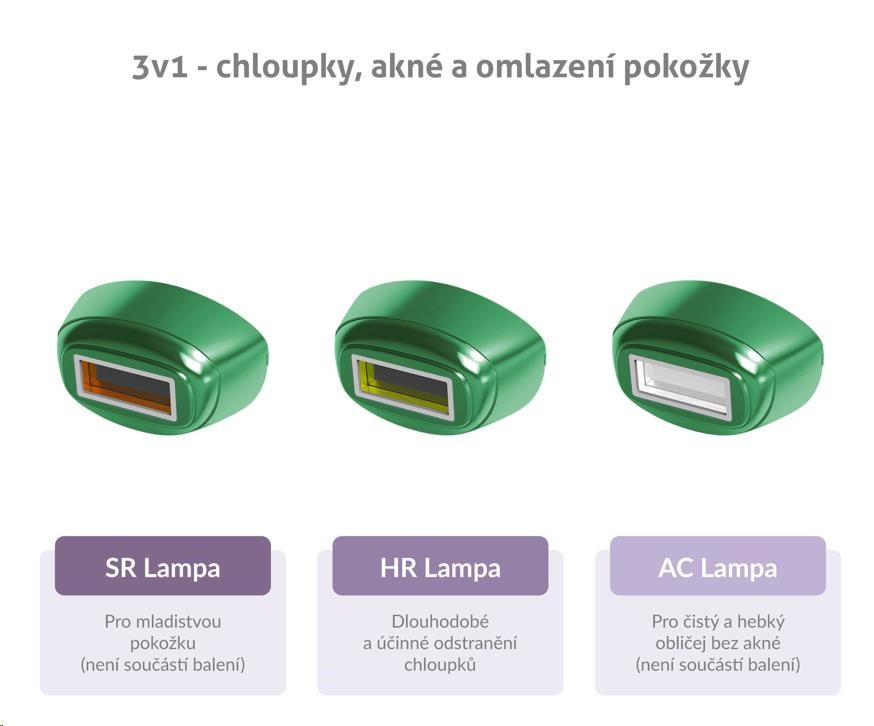 Epilátor TrueLife BELLE IPL E3 môžete využiť okrem samotnej epilácie aj na ďalšie aplikácie. Stačí len vymeniť lampu. K dlhodobému a účinnému odstráneniu chlpov poslúži HR lampa, ktorá je súčasťou balenia. Mnohých trápia akné. Ak chcete mať tvár čistú a jemnú na dotyk, odporúčame si zaobstarať AC lampu. Ak chcete svoju pleť omladiť, pomôže vám s tým SR lampa.