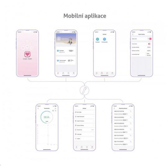 Batéria teplomera vydrží až na 20 000 meraní. Ovládanie zvládne každý – meranie prebieha stlačením jediného tlačidla. Ihneď po vybalení je teplomer pripravený na použitie. Všetko potrebné vidíte na LCD displeji alebo v mobilnej aplikácii vo svojom chytrom telefóne, ktorý môžete s teplomerom spárovať pomocou Bluetooth. Namerané hodnoty máte uložené v aplikácii, ktorá je v češtine, a ich históriu tak stále máte pri sebe a môžete ju zdieľať s lekármi alebo rodinou. Vývoj merania vidíte v aplikácii na prehľadnom grafe. Teplomer má navyše moderný dizajn, je praktický a vhodný na cesty. V balení nájdete aj obal, v ktorom môžete teplomer bezpečne uschovať.