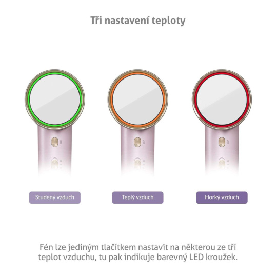 Jediným tlačidlom jednoducho vyberte teplotu, pri ktorej chcete vlasy vysušiť. Môžete si vybrať medzi režimom studeného vzduchu, teplého vzduchu, horúceho vzduchu a striedaním studeného a horúceho vzduchu. Pri rýchlosti sušenia si môžete vybrať medzi vysokou a normálnou rýchlosťou.