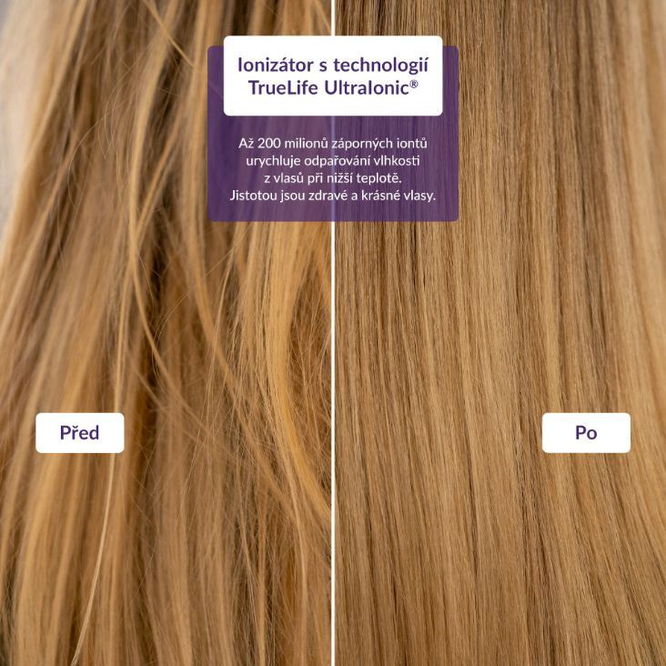 Doprajte svojim vlasom to najlepšie – fén s ionizátorom TrueLife HairDryer D6 im poskytne profesionálnu starostlivosť v pohodlí vášho domova. Jeho superrýchly motor s technológiou TrueLife UltraFlow® sa pýši výkonom až 110 000 otáčok za minútu. Ionizátor s technológiou TrueLife UltraIonic® generuje približne 200 miliónov záporných iónov, ktoré prispievajú k hladším a zdravším vlasom, pretože sušenie je šetrnejšie a rýchlejšie. Aktuálne zvolenú teplotu signalizuje farebný LED krúžok,pričom si môžete vybrať z 3 úrovní alebo režimov striedania studeného a horúceho vzduchu, ako aj z 2 rýchlostí sušenia. Dokonalý styling podporí aj magnetický koncentračný nadstavec, ktorý je súčasťou balenia. Už žiadne presušené a poškodené vlasy vďaka technológii TrueLife ConstantHeat®, ktorá počas sušenia udržuje stálu teplotu. Fén má veľmi tichý chod, bezpečnosť zaisťuje ochrana proti prehriatiu a údržby sa nemusíte obávať, pretože odnímateľný prachový filter sa dá ľahko odskrutkovať a vyčistiť.