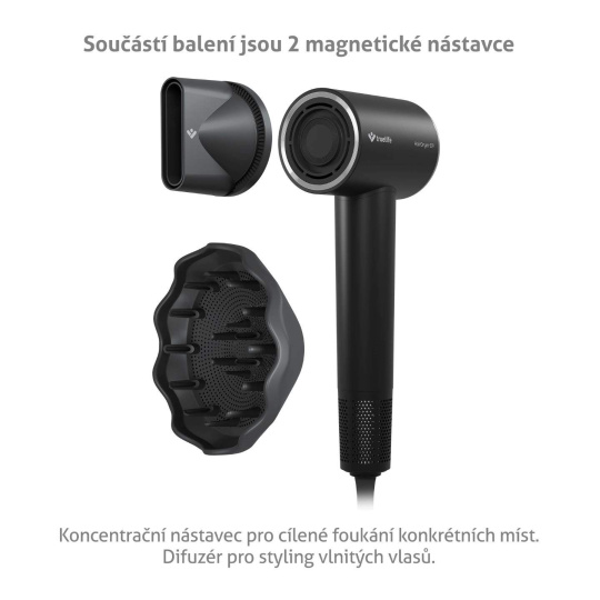 Fén sa dodáva s 2 nadstavcami, ktoré sa dajú rýchlo nainštalovať vďaka magnetu. Okrem fúkania môžete s nimi ľahko vytvárať aj styling. Na cielené fúkanie a úpravu konkrétnych miest použite koncentračný nadstavec. Difúzor dokáže udržať vlasy oddelené a zvýrazniť ich pri korienkoch.
